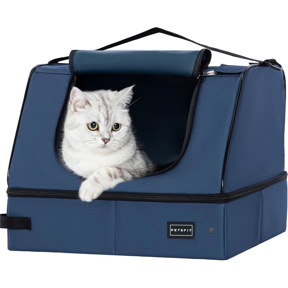 PETSFIT Portable Cat Litter Box - Removable 2-Layer Leak-Proof Lining, Scratch-Resistant Fabric with Sturdy Support Frame, Travel & Collapsible Cat Litter Box Black(Navy Blue(with lid))